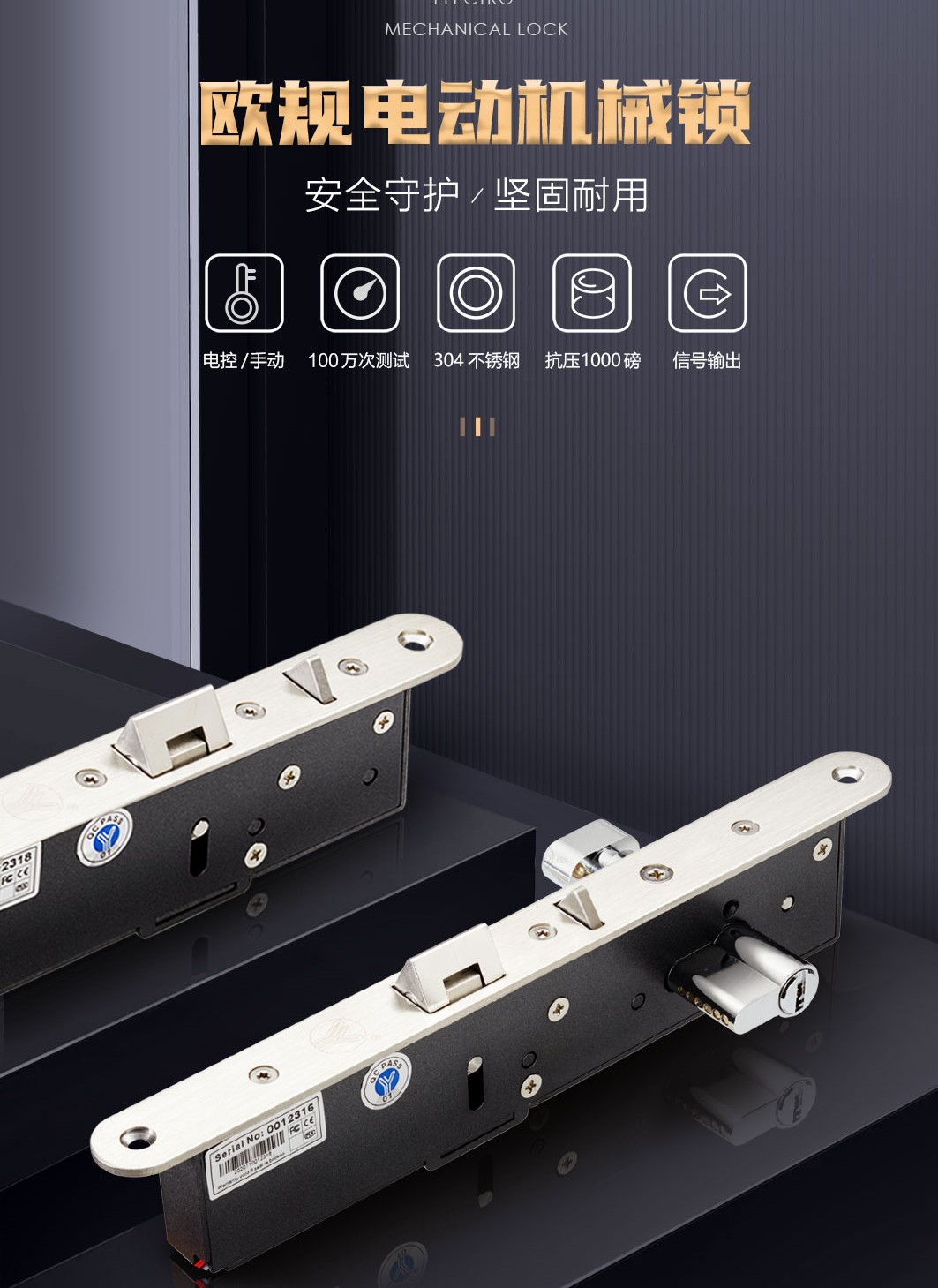 電子機械鎖應用于單向式雙向開的、木門、金屬門、有框玻璃門,電子機械鎖堅固的不銹鋼鎖體,具有獨特的安全設計,可自行設定電鎖工作模式,鎖舌可承受800kg的沖擊,配有歐規鎖芯設計,可以達到平時“電控”與緊急時“手動”雙用的目的。部件全部采用金屬結構,在60*C高溫或