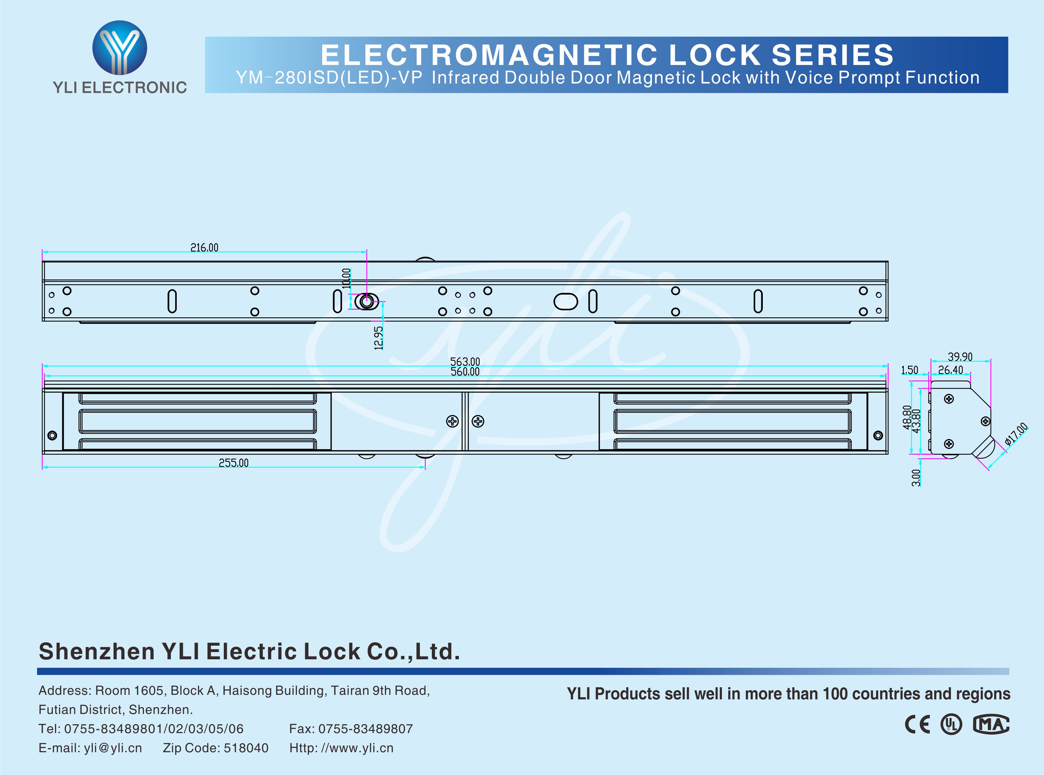 YM-280ISD(LED)-VP Double door magnetic lock is designed for wooden door, metal door, glass door and fireproof door. lt is equipped with dual functions of infrared sensor automatic unlocking and voice prompt. When the infrared sensor detects people, it will issue a voice prompt of "The door is open" and unlock. The infrared sensing distance is 3 meters and it is wide-angle with 130 degrees. The lock has an adjustable time delay function of 0/3/6/9 seconds. There is a set of lock status signal (NO/NC/COM) output contacts. The lock body is equipped with a large LED light. The green light indicates unlocking, and the red light indicates locking. YLl magnetic lock cores are produced with robotic laser welding technology, providing 2 to 3 times stronger impact resistance and torsional resistance than conventional production processes. The surface is treated with the internationally leading electroplating process and the lock itself has passed the 240-hour salt spray test in the national laboratory, achieving excellent performance of anti-oxidation, anti-rust and anti-corrosion.Our company offers a complete range of brackets for different locks.