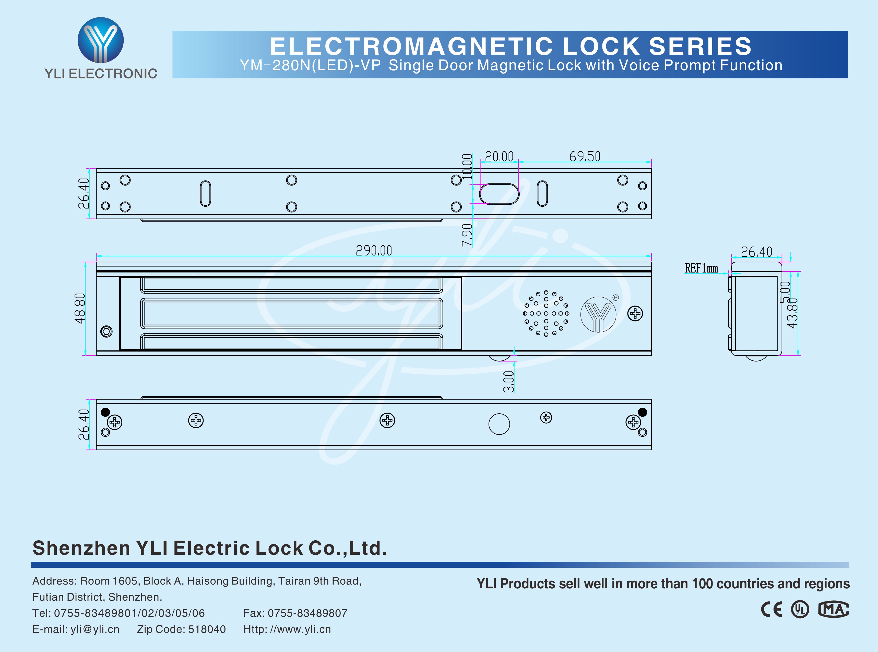 YM-280(LED)-VP Single door magnetic lock is designed for wooden door, metal door, glass door and fireproof door. A voice prompt of "The door is open" will be issued when unlocking. There is an adjustable time delay function of 0/3/6/9 seconds and a set of lock status signal (NO/NC/COM) output contacts which provides real-time feedback for the access control system. The lock body is equipped with a large LED light . The green light indicates unlocking , and the red light indicates locking. YLI magnetic lock cores are produced with robotic laser welding technology, providing 2 to 3 times stronger impact resistance and torsional resistance than conventional production processes. The surface is treated with the internationally leading electroplating process and the lock itself has passed the 240-hour salt spray test in the national laboratory, achieving excellent performance of anti-oxidation, anti-rust and anti-corrosion.Our company offers a complete range of brackets for different locks.