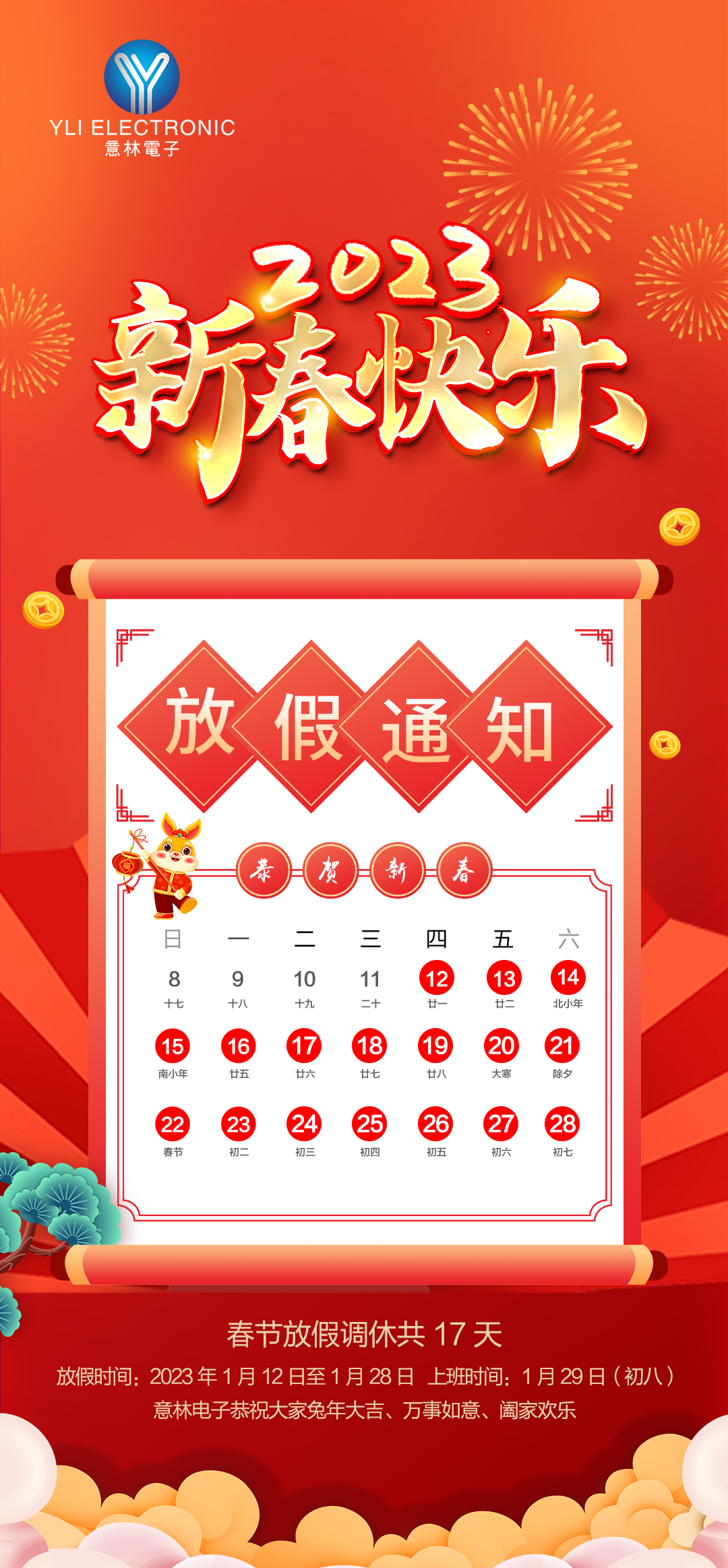 放假時間-- 春 節(jié): 2023年01月12日至2023年01月28日放假,共17天。