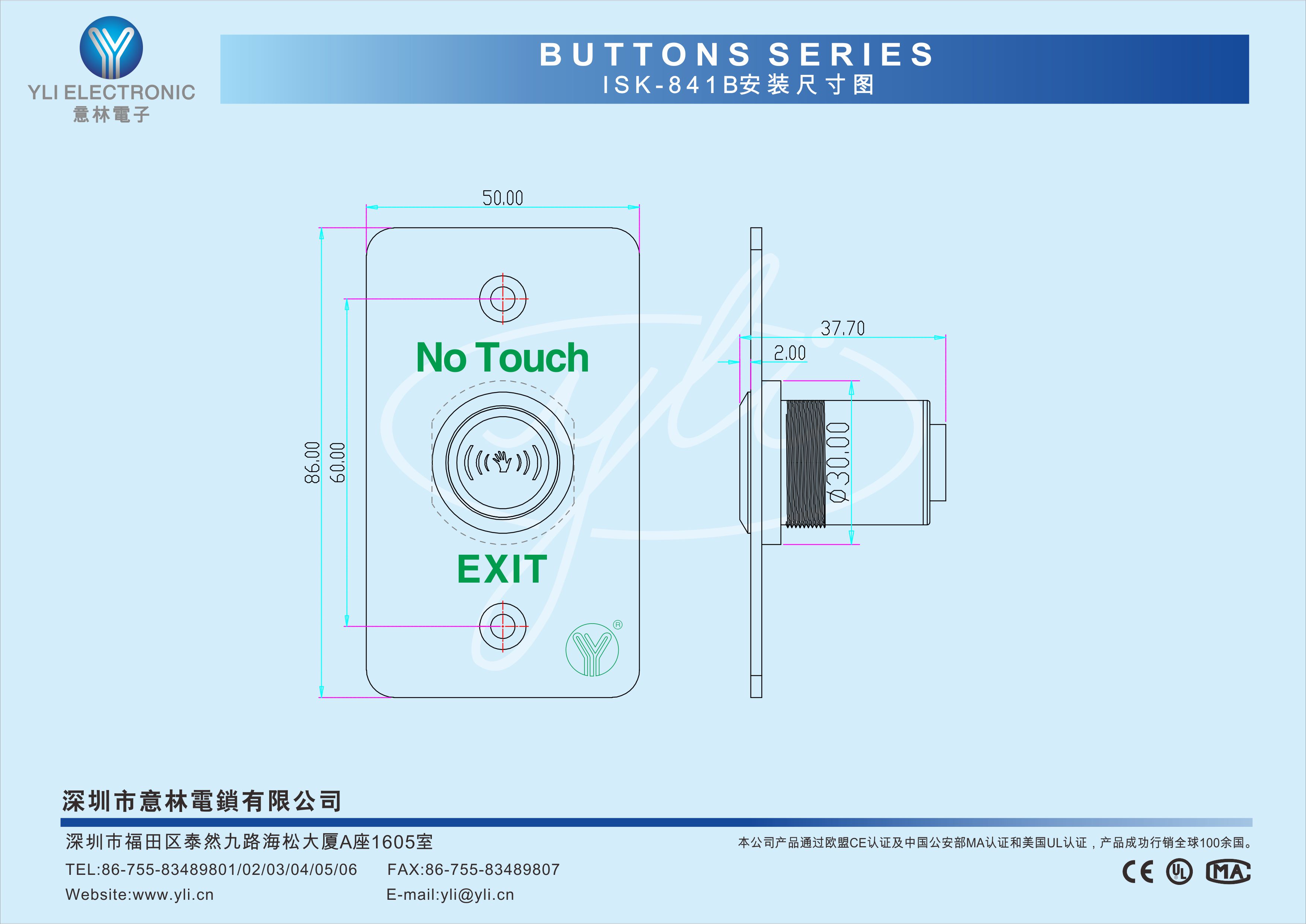 ISK-841B(LED) 是一款紅外感應門禁開關, 具有延時可調功能及紅外感應功能,感應距離4-12cm可調。LED燈顯示: 紅色待機狀態; 綠色動作狀態。采用304不銹鋼拉絲工藝處理,耐磨抗沖擊,堅固耐用。適用于智能樓宇、住宅小區、辦公樓、酒店、醫院、體育館等場所使用。