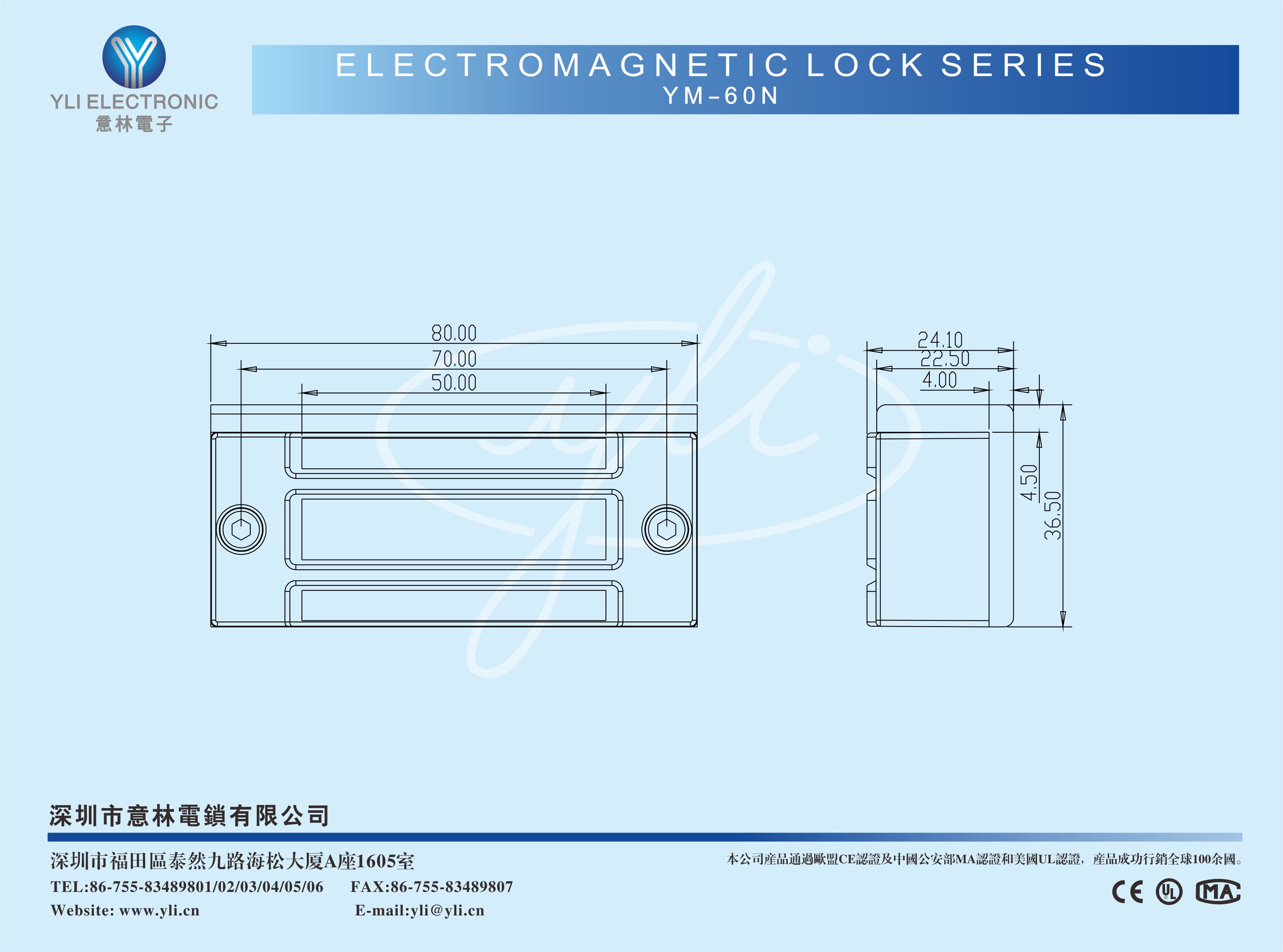 YM-60N/YM-60N-S迷你型單門磁力鎖是針對一般櫥窗門、儲物柜門等小型柜門設計的,吊裝式設計,安裝時省時、省力。內開式門或無框玻璃門、窄框等均有附件配套,特殊防殘磁設計,讓門禁自動化更安全。